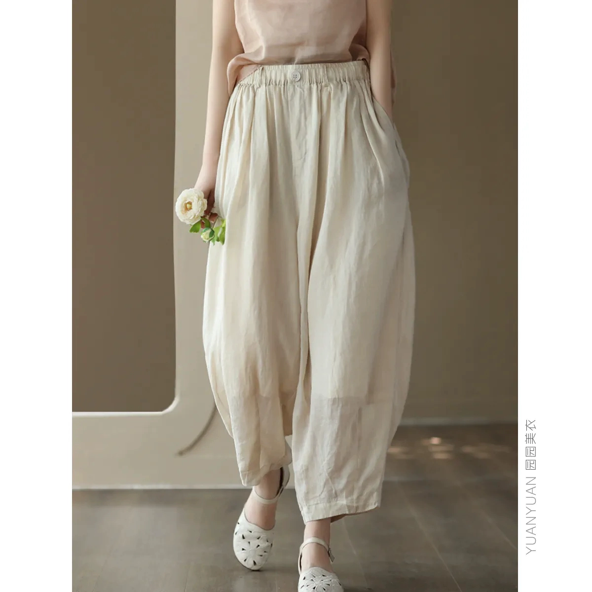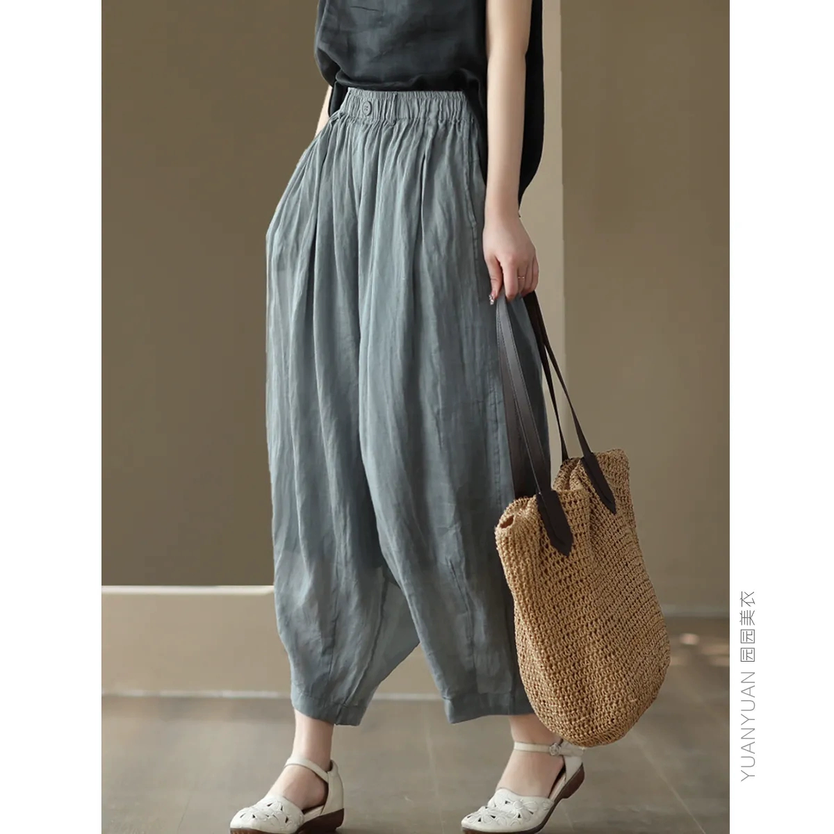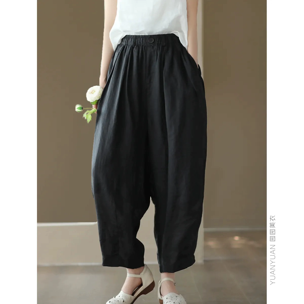 | nameOriginal | Summer New Style Retro Solid Color Linen Harem Pants Women's Elastic Waist Loose Slim Versatile Casual Nine-Point Carrot Pants |