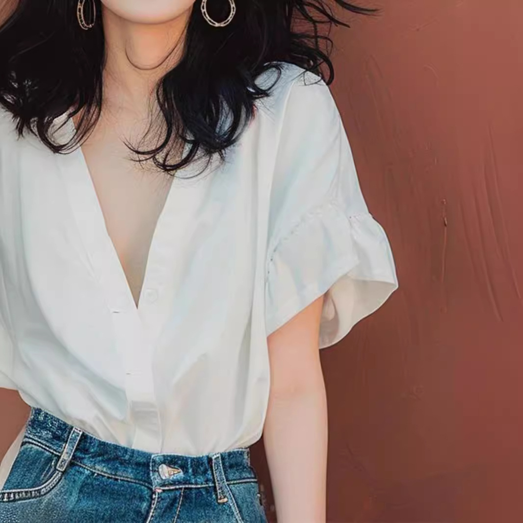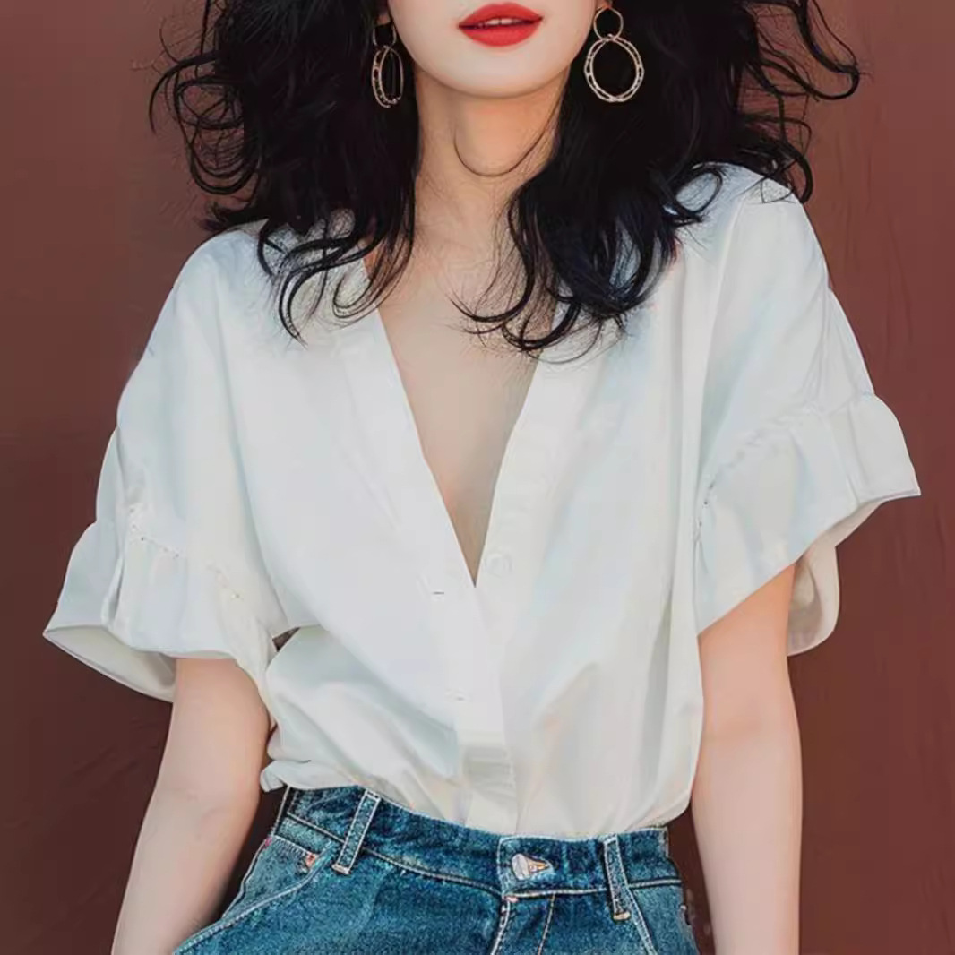| nameOriginal | Summer New Style Unique Belly Covering Slimming Top Light Mature French Niche White Horned Sleeve V-Neck Short Sleeve Shirt |