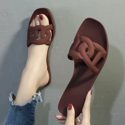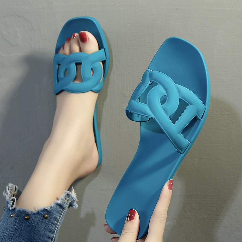 صنادل مسطحة صيفية جديدة بثلاثة أحزمة على شكل خنزير أنف للشاطئ أحذية نسائية من البلاستيك PVC بكلمة واحدة