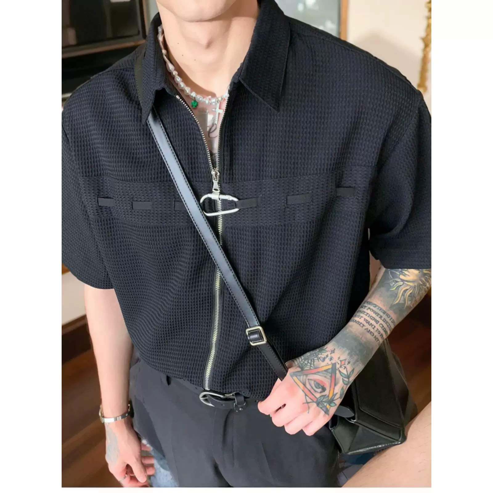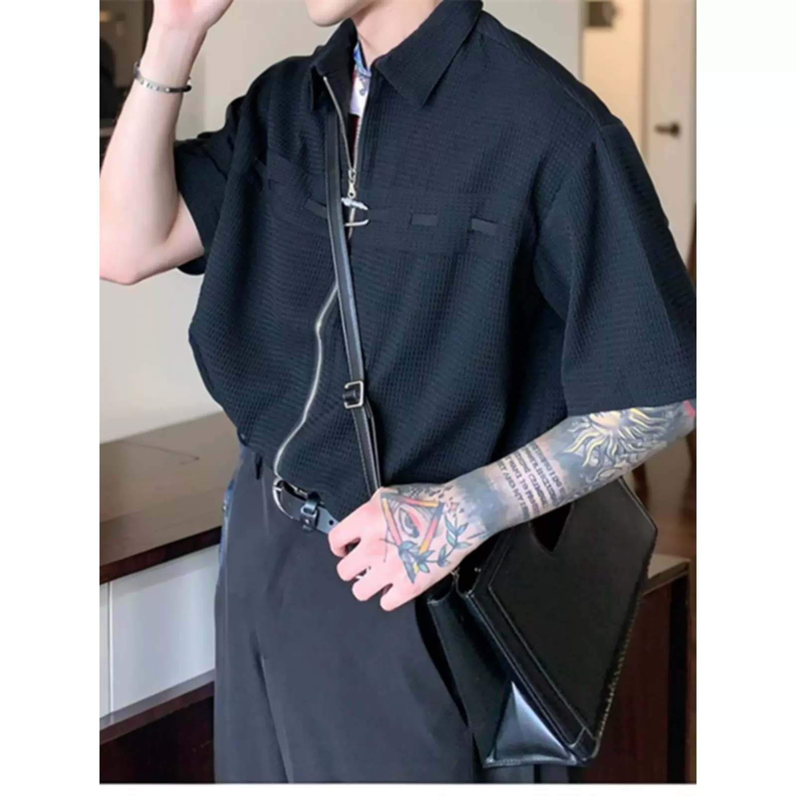 | nameOriginal | Summer new waffle design zipper shirt men's Korean version high-end niche metal handsome short-sleeved shirt trendy |