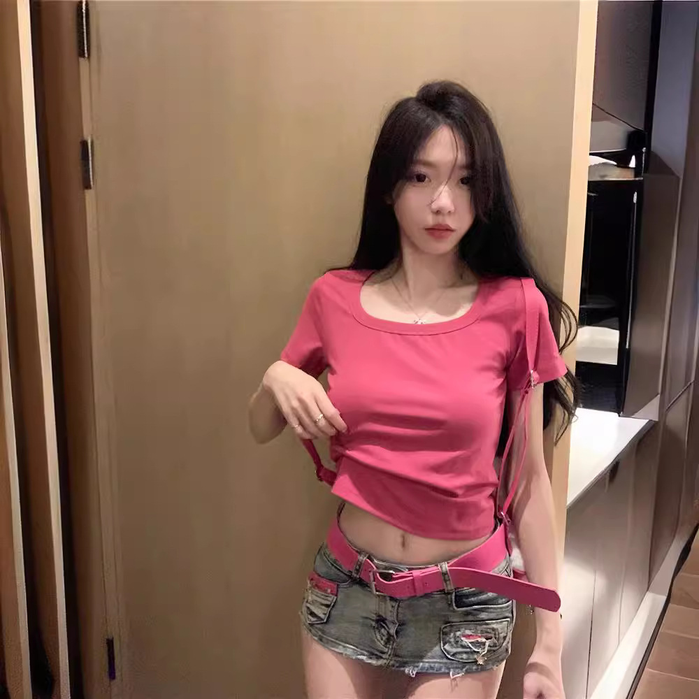 | nameOriginal | Summer New Women's Sweet and Spicy Style Elegant Slim-fit Slimming Short Top for Little Men Square Collar Shoulder Short-sleeve T-shirt |