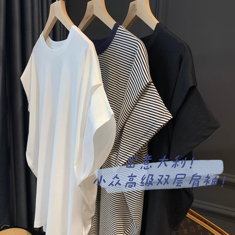 | nameOriginal | Summer plus size Women's Loose Niche Design Double Shoulder Short Sleeve Striped T-shirt Loose Knitted T-shirt Top |