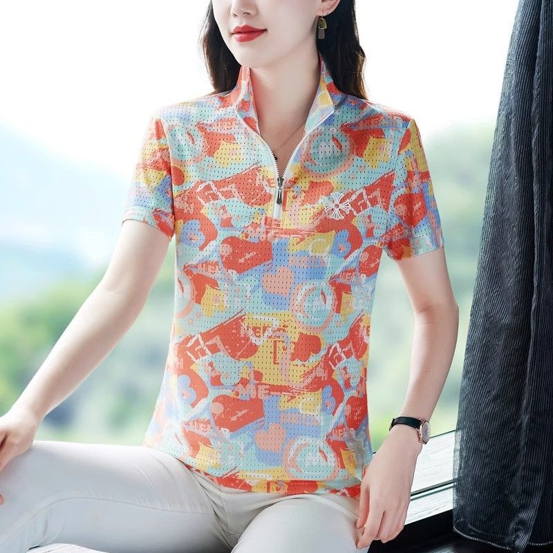 | nameOriginal | Summer Short-sleeved T-shirt Women's Summer Fashion Zipper Elegant Mother's Printed Half-sleeved Loose Slimming Quick-drying Top Breathable |