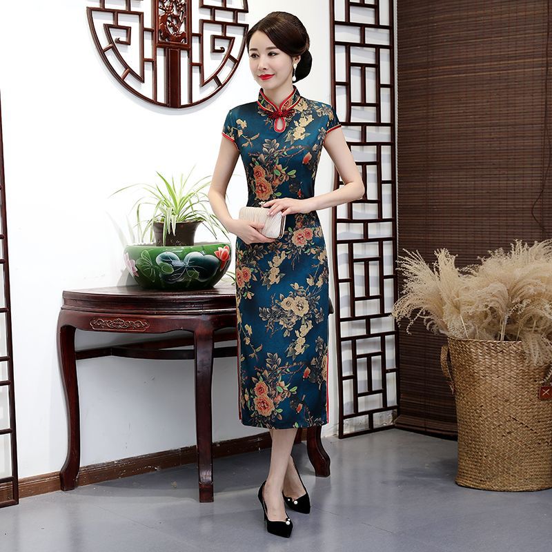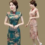 الصيف قصيرة الأكمام Xiangyun الغزل شيونغسام فستان طويل منتصف العمر المرأة النمط الصيني الرجعية تحسين العمودي طوق شيونغسام