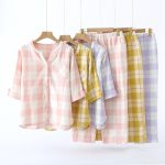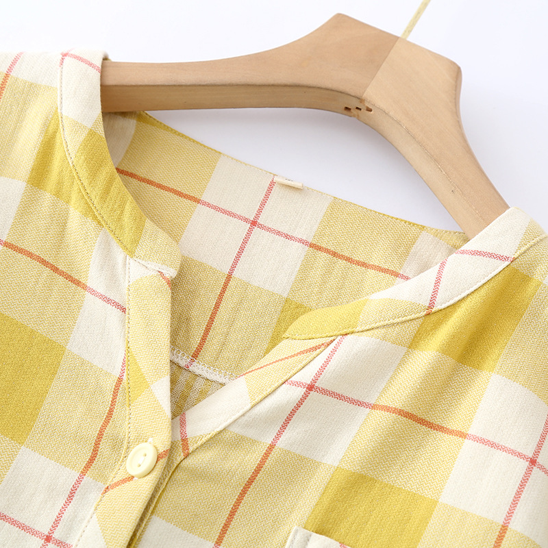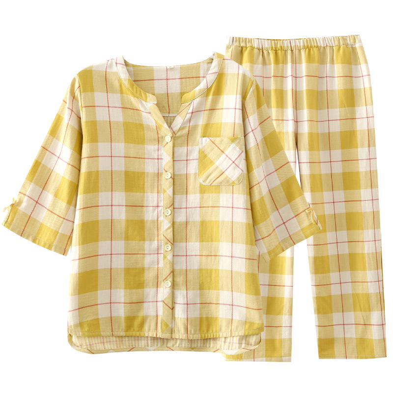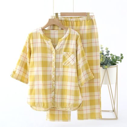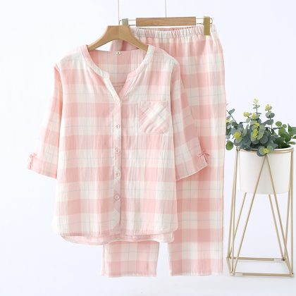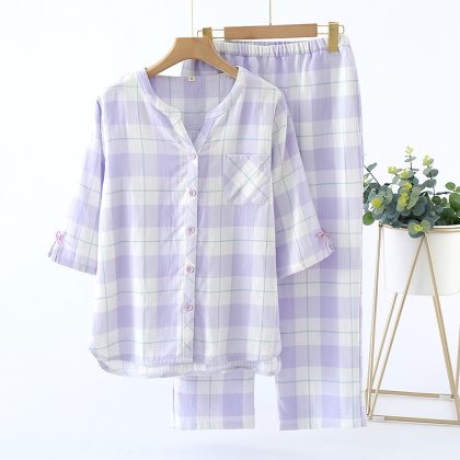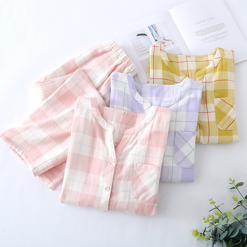 | nameOriginal | Summer Simple Japanese Style Plaid Women's Pajamas Cotton Gauze Thin Short-sleeved Ankle-length Pants Outwear Home Suit |