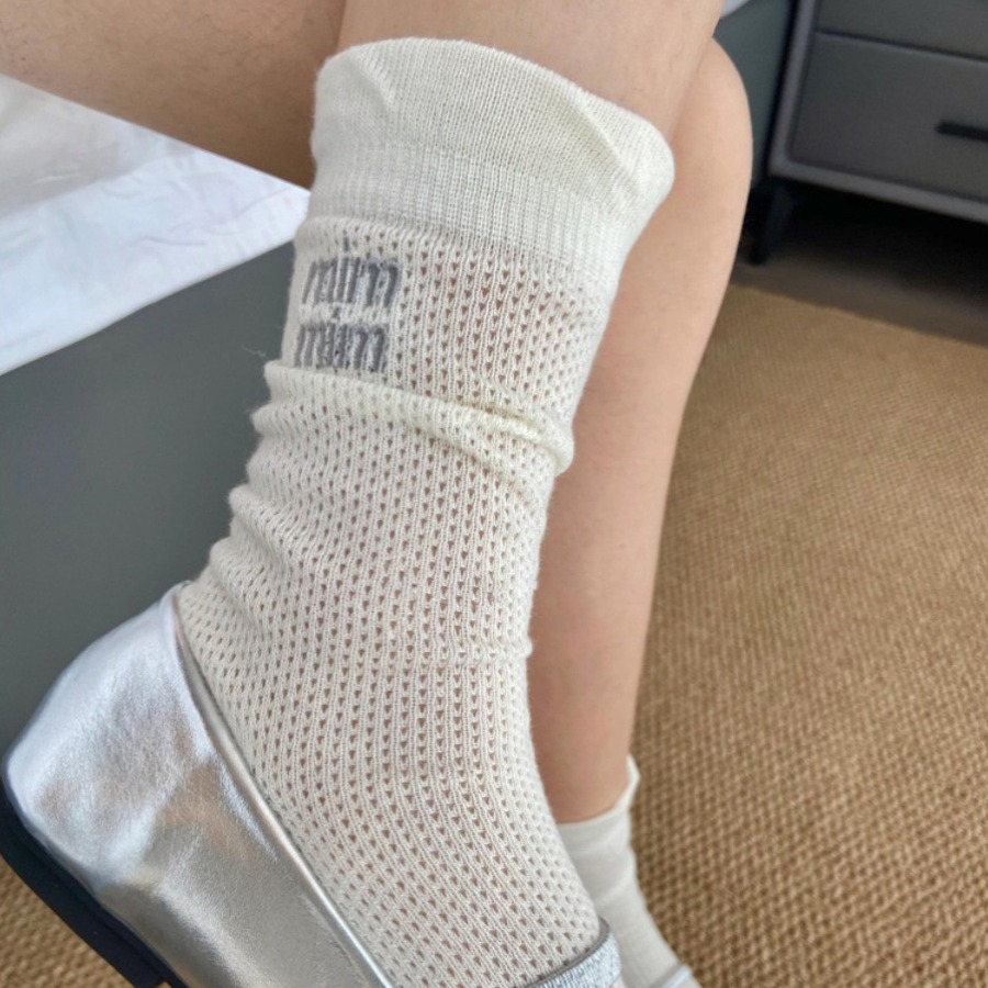 | nameOriginal | Summer Solid Color Embroidery Socks Women's White Middle Tube Thin Stacking Socks Miu Style Hollow Mesh Simple Cotton Stockings |