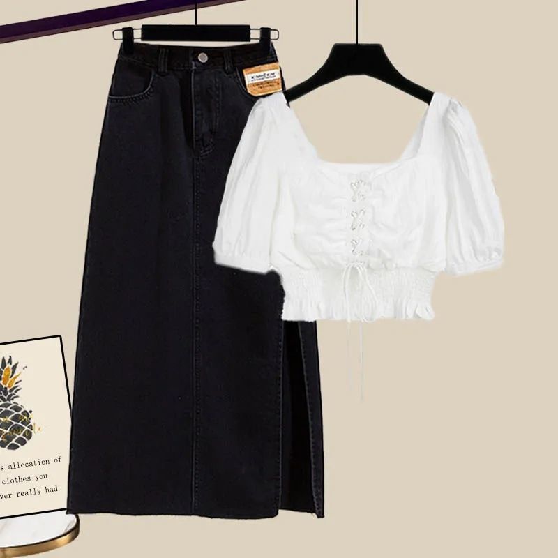 | nameOriginal | Summer suit women's 2022 new plus size women's clothing age-reducing short sleeve shirt high waist Denim skirt two-piece fashion |