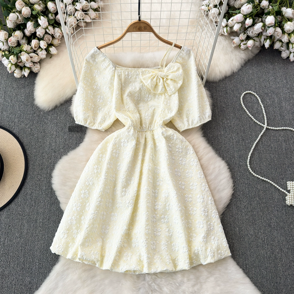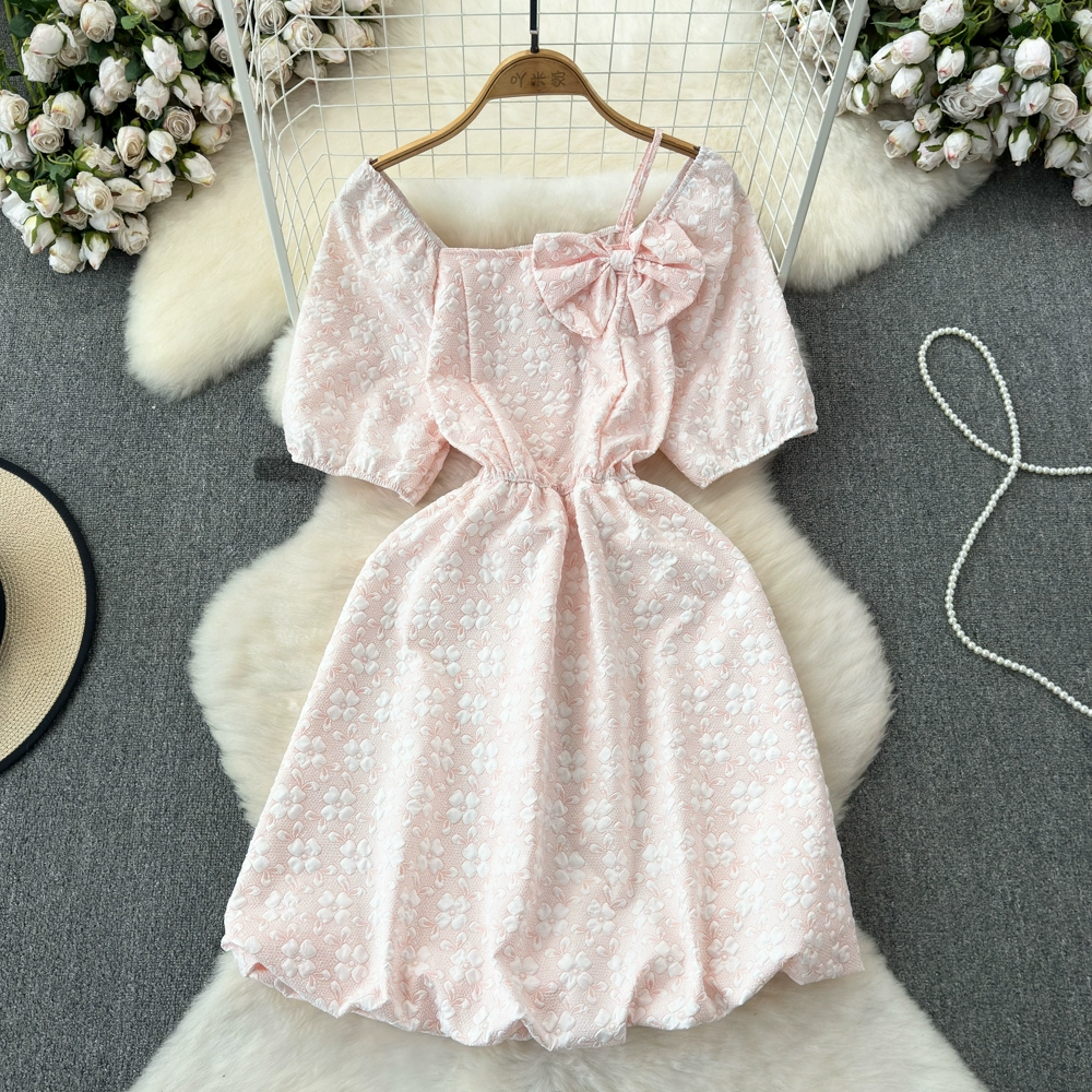 | nameOriginal | Summer super fairy gentle style sweet bubble short-sleeved square neck halter neck waist slimming A-line jacquard puffy dress |