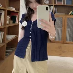 | nameOriginal | Summer sweet and discreet exquisite design versatile pearl button short-sleeved T-shirt women's V-neck sweater temperament top |