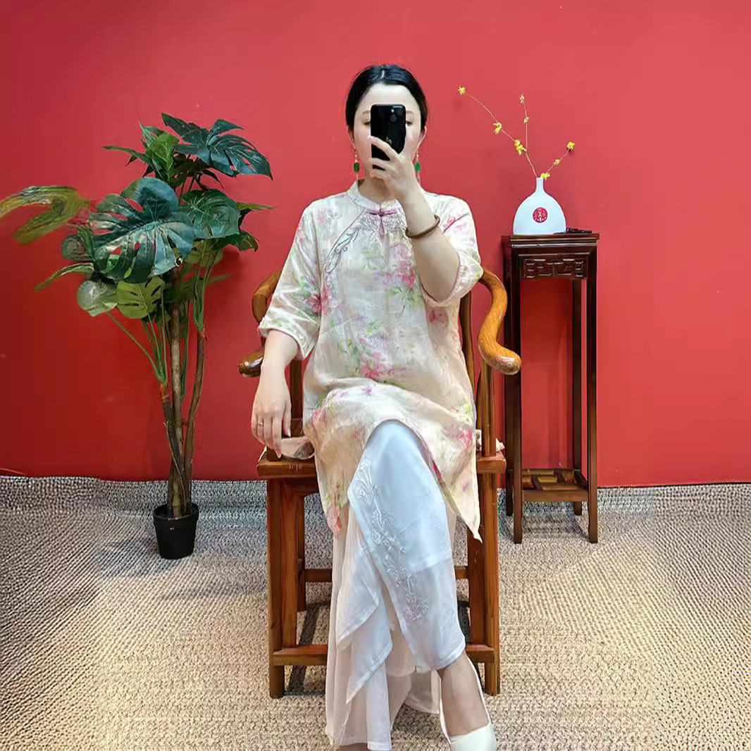 قميص صيفي رقيق من القطن والكتان 2024 قميص جديد مطرز متوسط ​​الطول بإبزيم رامي قميص على الطراز الصيني الجديد