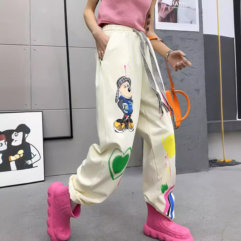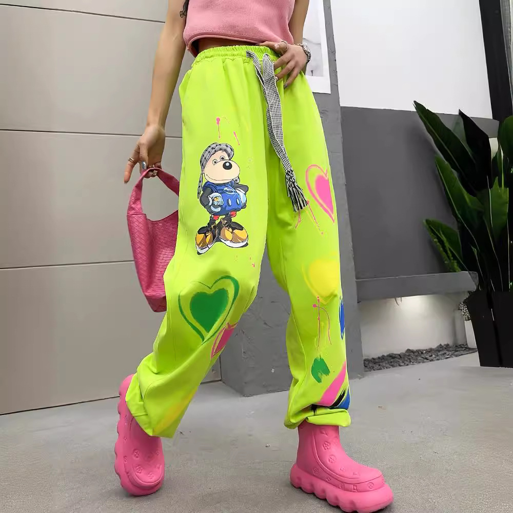 الصيف التعادل صبغ العلامة التجارية العصرية سراويل تقليدية حجم كبير حشد السراويل النسائية شخصية الكرتون الكتابة على الجدران الخصر السراويل الأنيقة للنساء