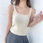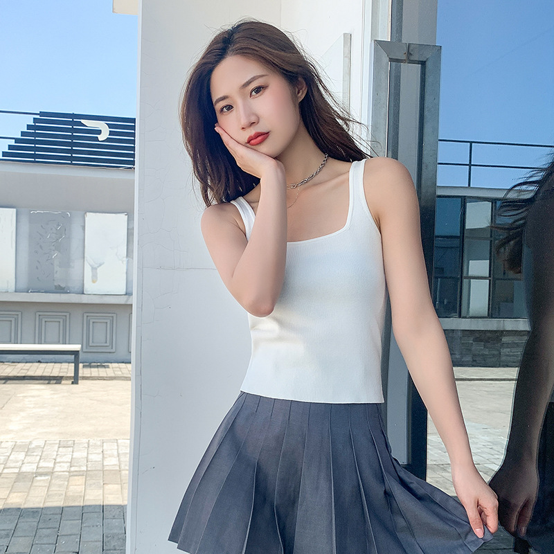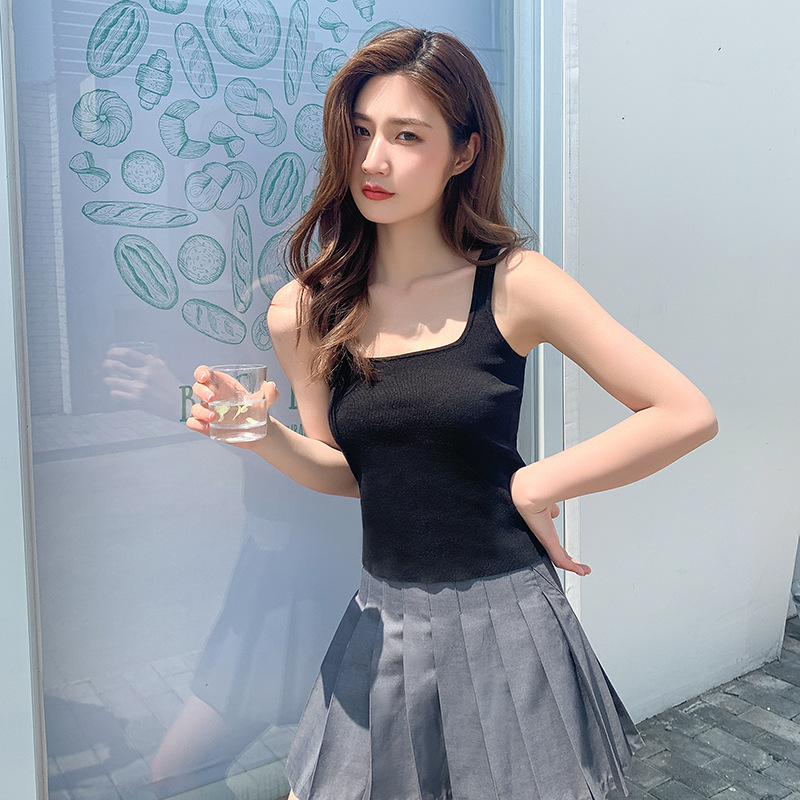 Summer Women's New Ice Silk Knitted Sweater Sling Vest Square Collar Clothing Spice Girl Top Short Inner Base Shirt