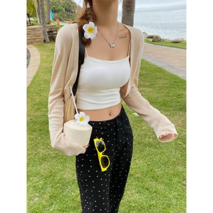 سترة واقية من الشمس محبوك معطف المرأة 2024 الصيف رقيقة زلة تنورة قميص الحرير الجليد صدرية قصيرة