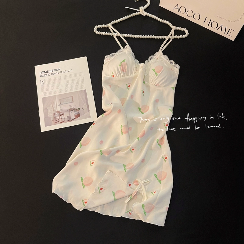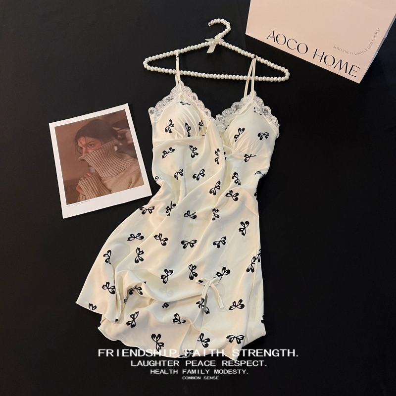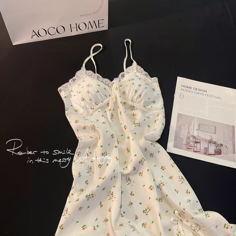 | nameOriginal | Suspender nightgown for women summer ice silk pajamas thin sexy lace with chest pad 2024 new internet celebrity style home clothes |