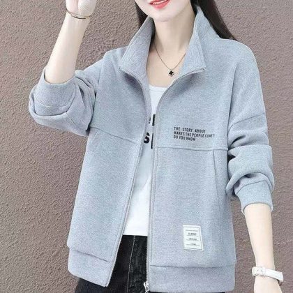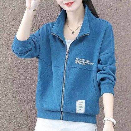 سترة نسائية فضفاضة كاجوال معطف أنيق ورقيق ومتوافق مع ياقة قصيرة وأكمام طويلة وسحاب سترة معطف الخريف والشتاء