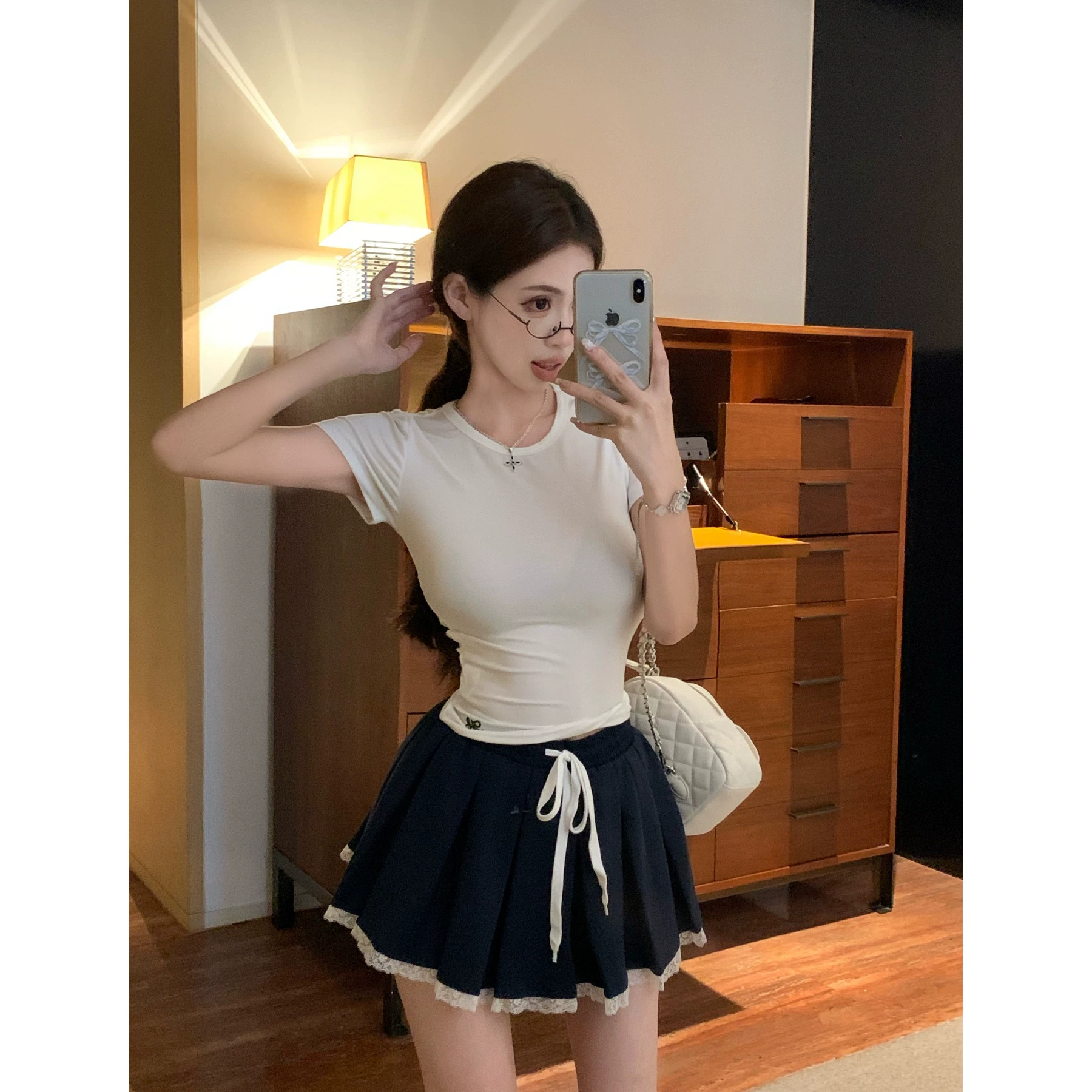 | nameOriginal | Sweet and spicy age-reducing suit for women summer 2024 new embroidered short-sleeved T-shirt drawstring lace splicing skirt two-piece set |