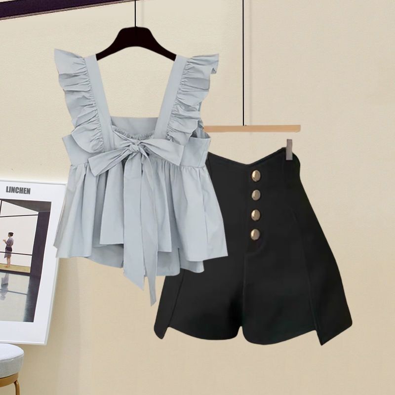 | nameOriginal | Sweet Backless Two-Wear Bow Strap Flying Sleeve Shirt Women's Summer New Niche Belly Covering Slimming Top |