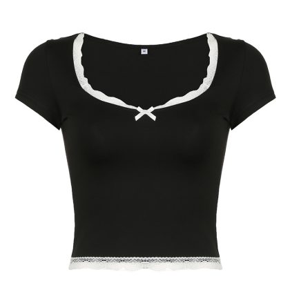 | nameOriginal | Sweet Girl's Fresh Solid Color T-shirt Ins Fashionable Lace Stitching Slim-Fit Square Collar Summer All-Match Top |