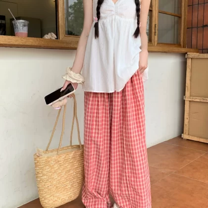 Sweet Women's Summer Versatile Straight Plaid Lace Pants