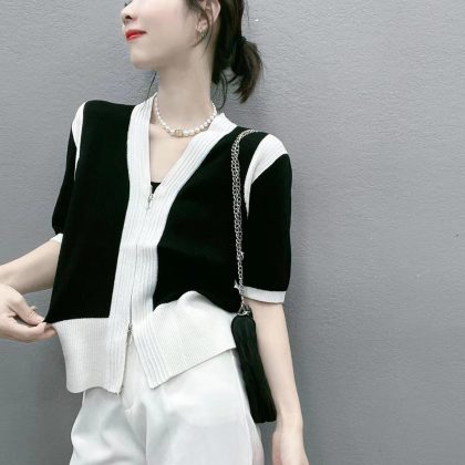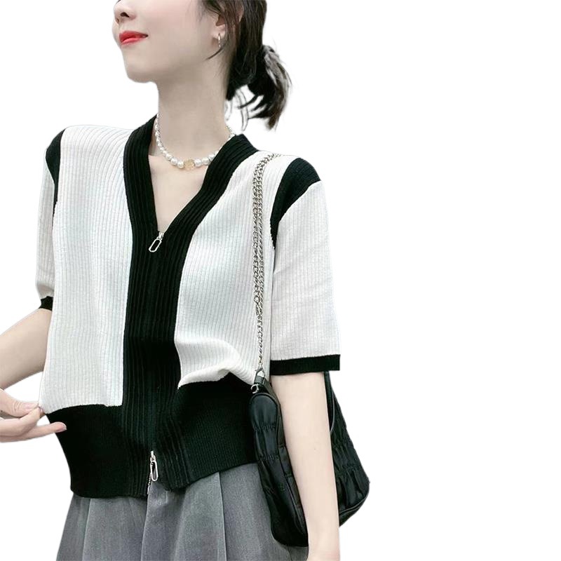 T Counter Shopping Mall Withdraws First-Line Export Cut Label Tail Sheet Women's V-Neck Black and White Stitching Zipper Short Sleeve Knitted Open