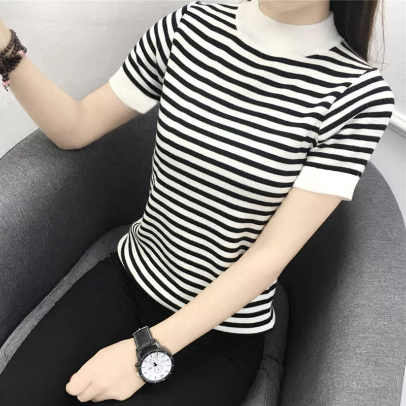 | nameOriginal | T-shirt ice silk pullover half turtleneck striped top short sleeves |