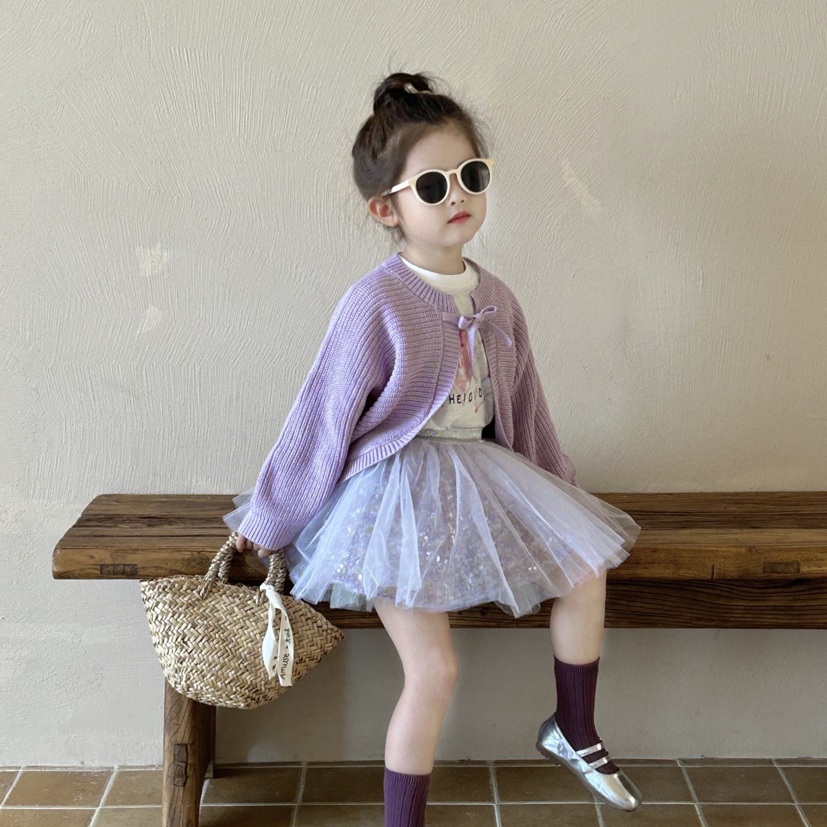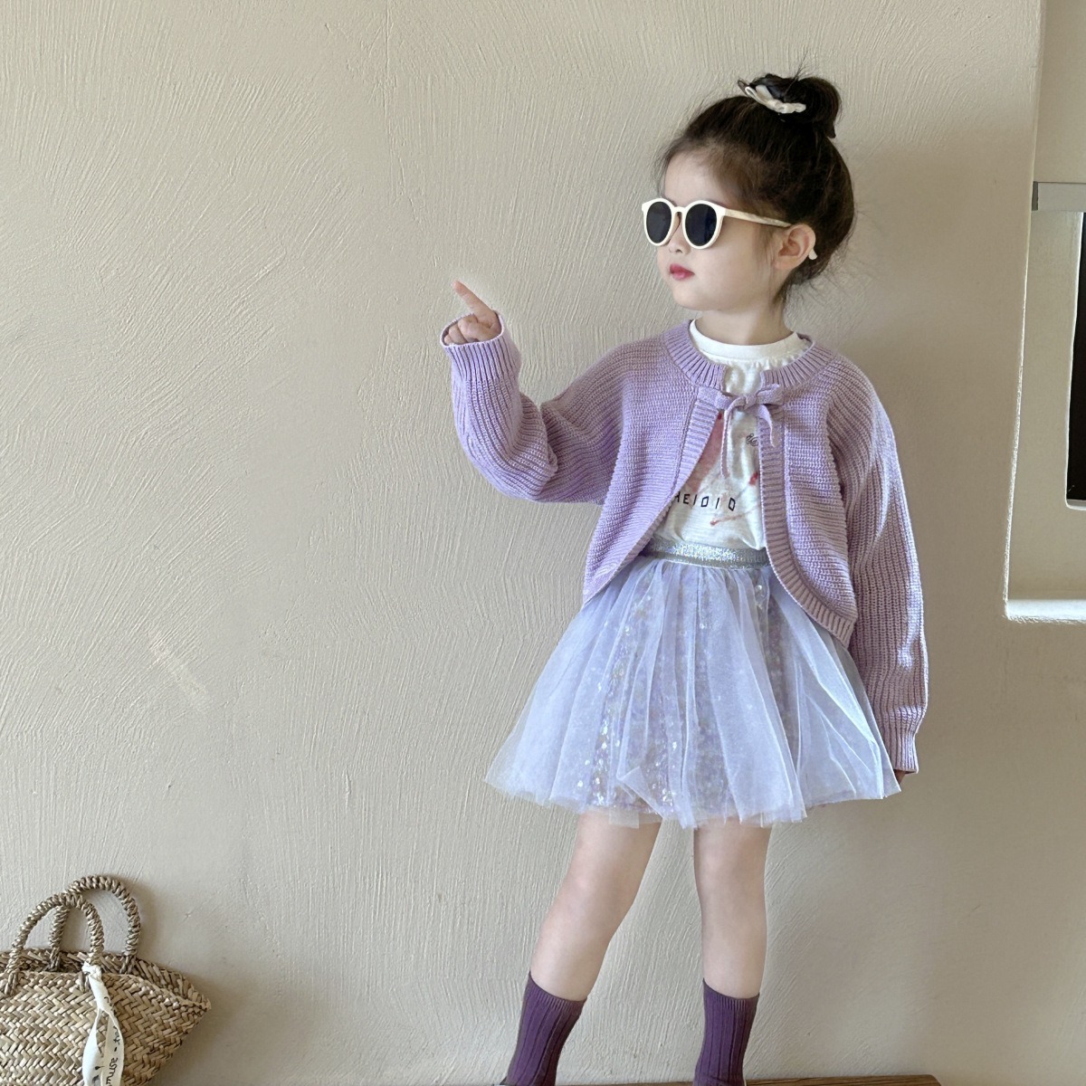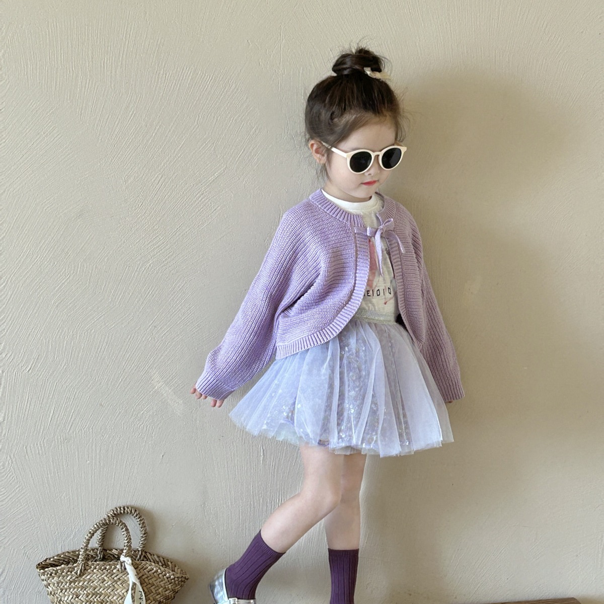 | nameOriginal | Taro purple sweater cardigan 2024 New Girls medium and small children baby Western style inner wear T + mermaid purple yarn culottes |