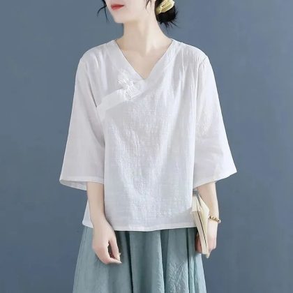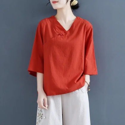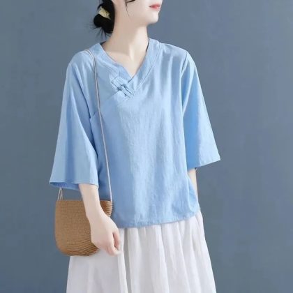 Tea Suit 2023 Summer New Button V-Neck Retro Large Size Loose Top T-Shirt Women's Style Zen Women's Cross-border Amazon