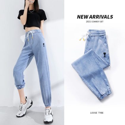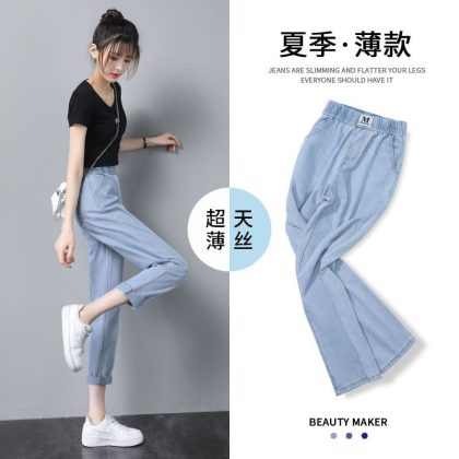 جينز ايوسل نسائي صيفي رقيق 2024 جديد عالي الخصر للتخسيس الكل مباراة مصنوع من الحرير الجليدي سروال هارلان أبي العصري
