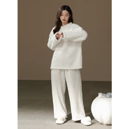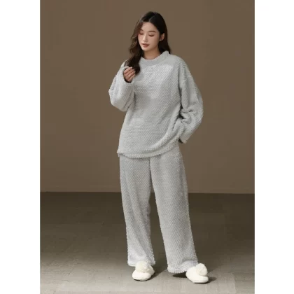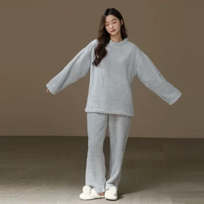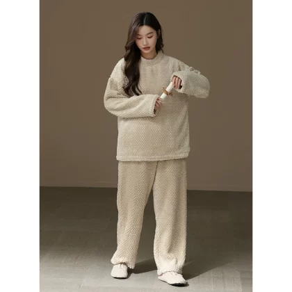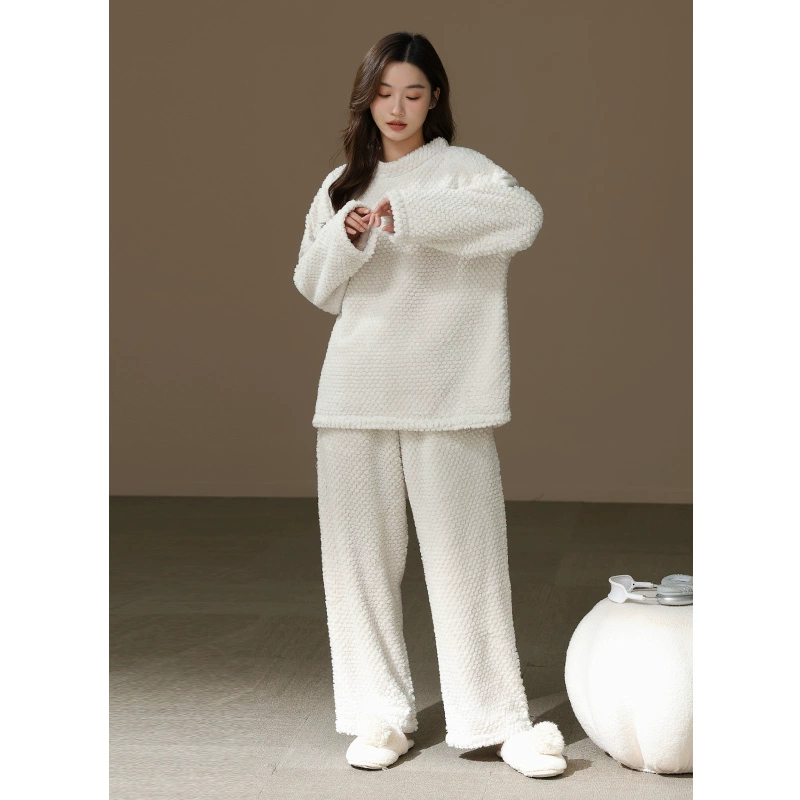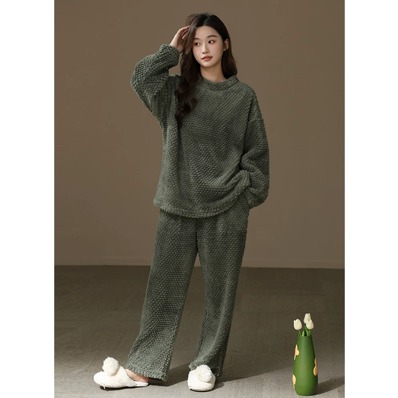 [Thick and Velvet] Women's Round Neck Pajama Set Autumn and Winter Coral Velvet Warm Solid Color Home Clothes Can Be Weared Outside