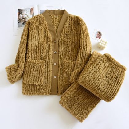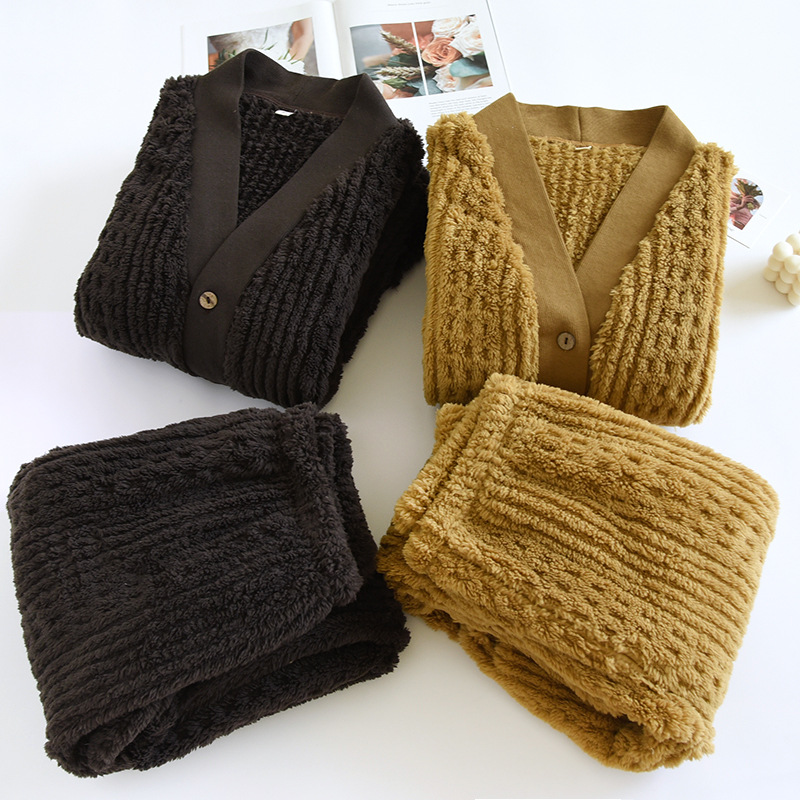 Thickened Fleece-lined Warm Pajamas Women's Men's Winter Flannel Long-sleeved Trousers Cardigan Couple's Home Clothes Set