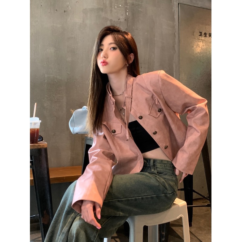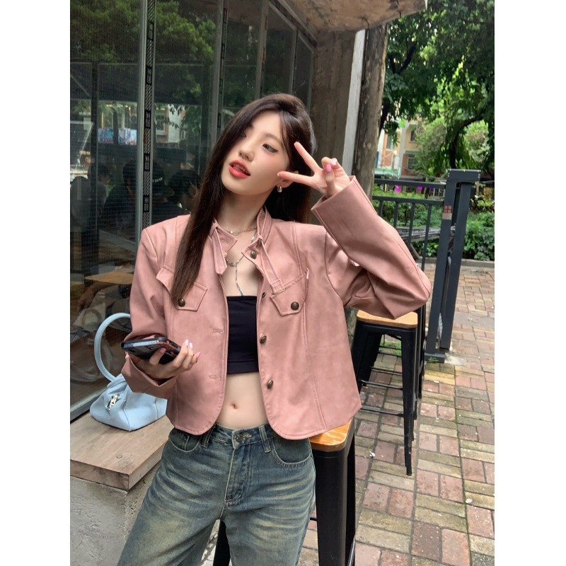 | nameOriginal | This year's popular pink leather coat women's spring and spring American design sense niche short motorcycle leather jacket top |