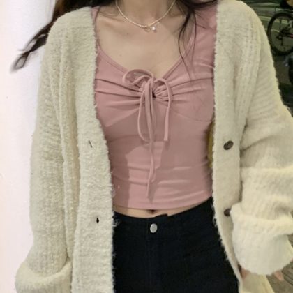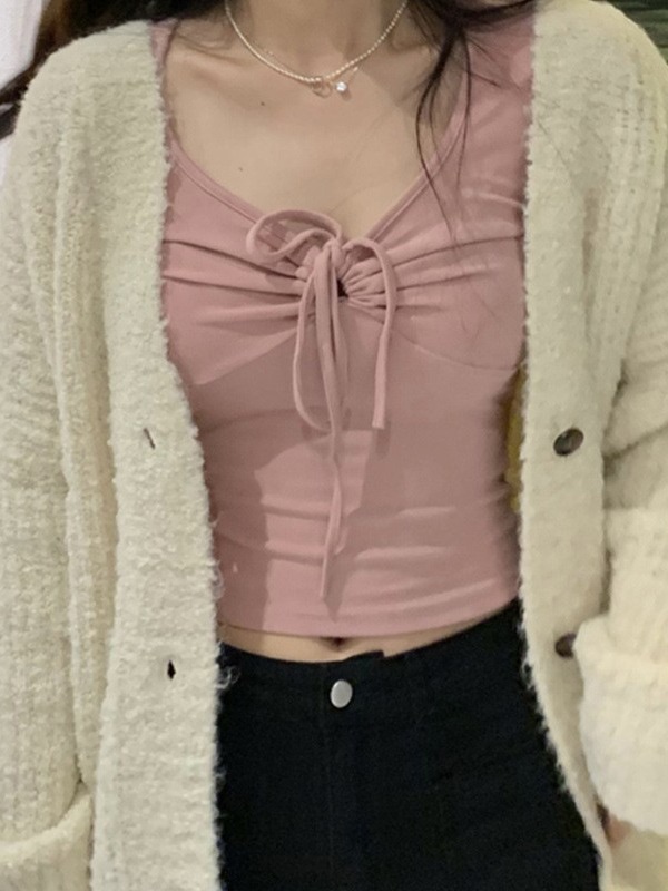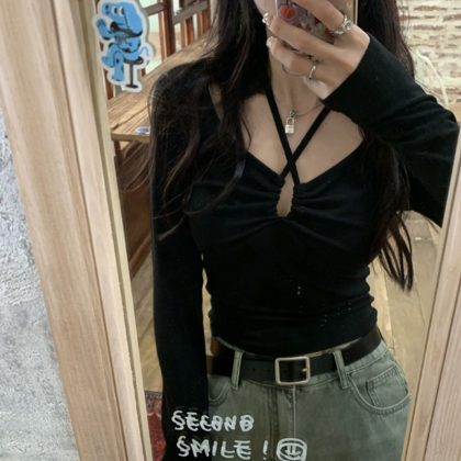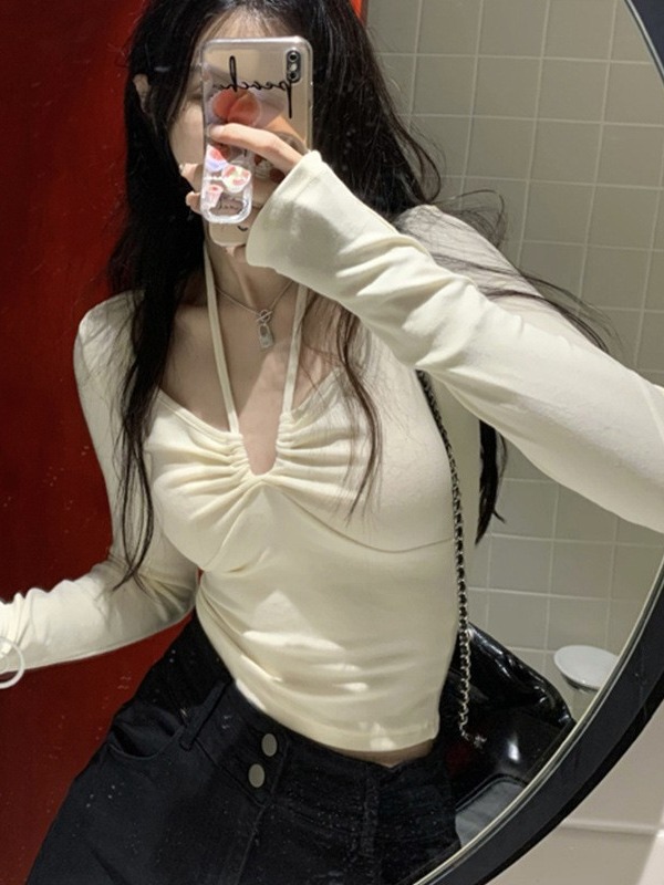 Threaded Base Shirt Women's Autumn New Design Sense Niche Inner Slim-fit Slimming V-neck Spice Girls T-shirt Top for Outer Wear