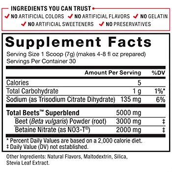 | nameOriginal | Force Factor Total Beets Drink Mix Superfood Powder with Nitrates to Support Circulation,Blood Flow,Nitric Oxide,Energy,Endurance,and Stamina,Cardiovascular Heart Health Supplement,30 Servings |