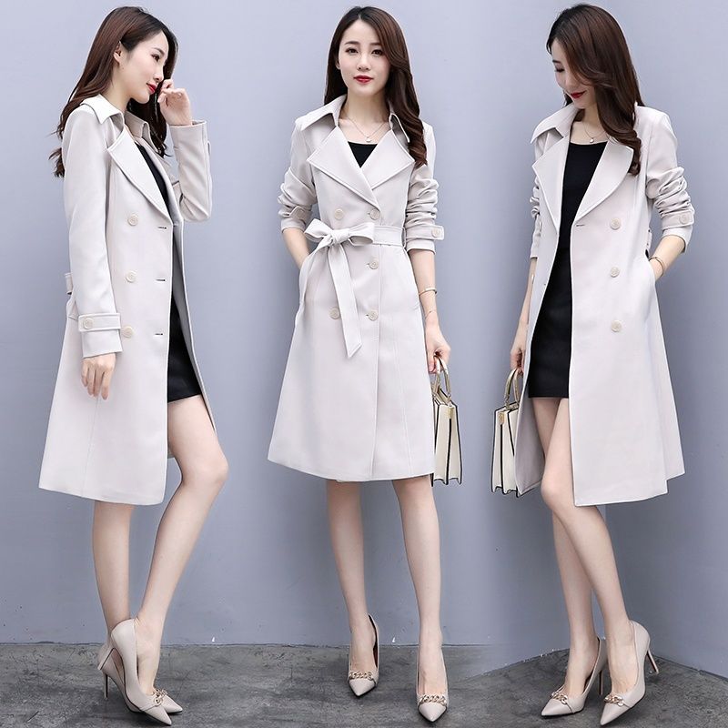 معطف واق من المطر للنساء متوسط ​​الطول 2023 ربيع جديد على الطراز الكوري فوق الركبة معطف صغير شعبي أبيض كريمي للربيع والخريف