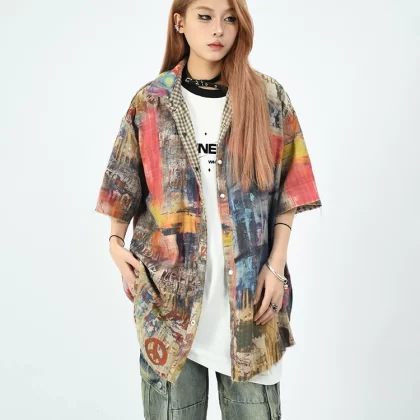 قميص أصلي فضفاض ذو حافة خام ذو وجهين وأكمام قصيرة