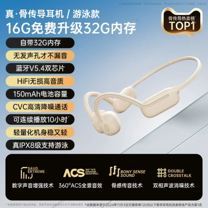 True bone conduction Bluetooth headset, special for running, sports-type, does not enter the ear, bone sensing hanging neck type, 2024 new model for swimming
