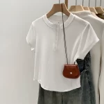 | nameOriginal | Unique round neck ribbed front shoulder short sleeve top with buttons |