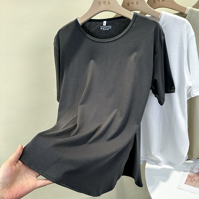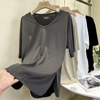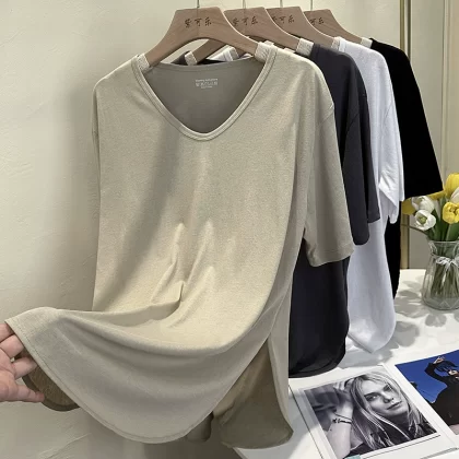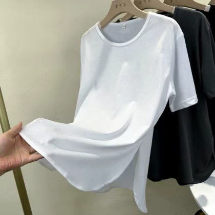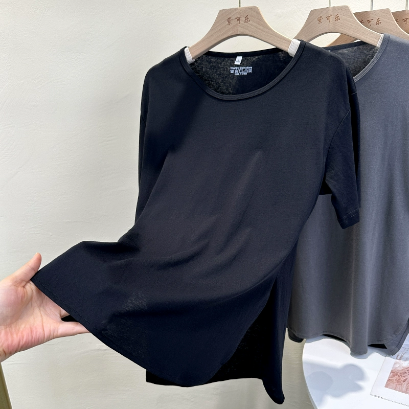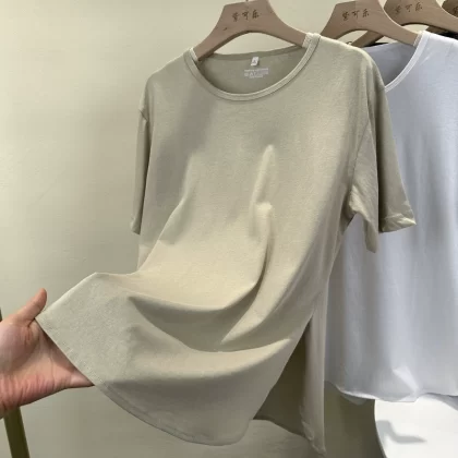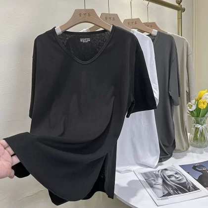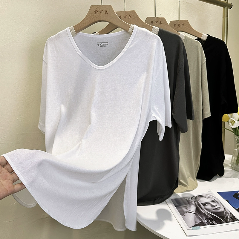 | nameOriginal | V-neck design short-sleeved T-shirt women's solid color simple slit round hem mid-length top large size loose slimming literary summer |
