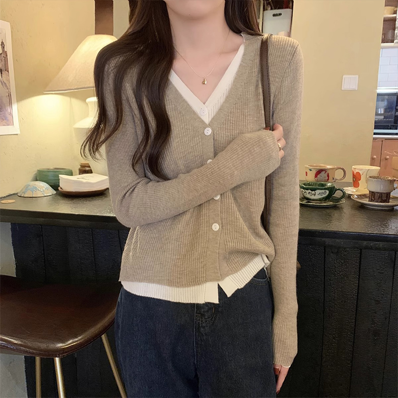 V-neck fake two-piece contrast sweater cardigan 2024 spring autumn winter South Korea slim lazy knitted base shirt women's top