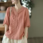 | nameOriginal | V-neck lace patchwork ramie embroidered quarter-sleeved shirt |