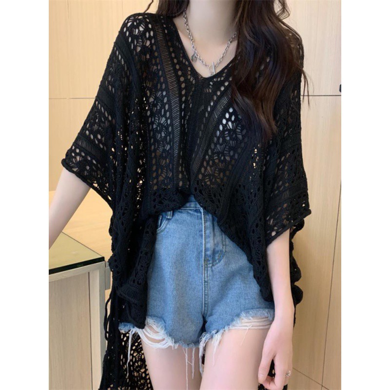 V-neck openwork short-sleeved sweater women's thin spring design niche unique chic loose blouse top