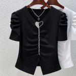 تي شيرت نسائي قصير برقبة على شكل حرف V وأكمام قصيرة بتصميم عصري صيفي على الطراز الغربي يناسب الجميع بقصة ضيقة غير منتظمة ذات ثنيات