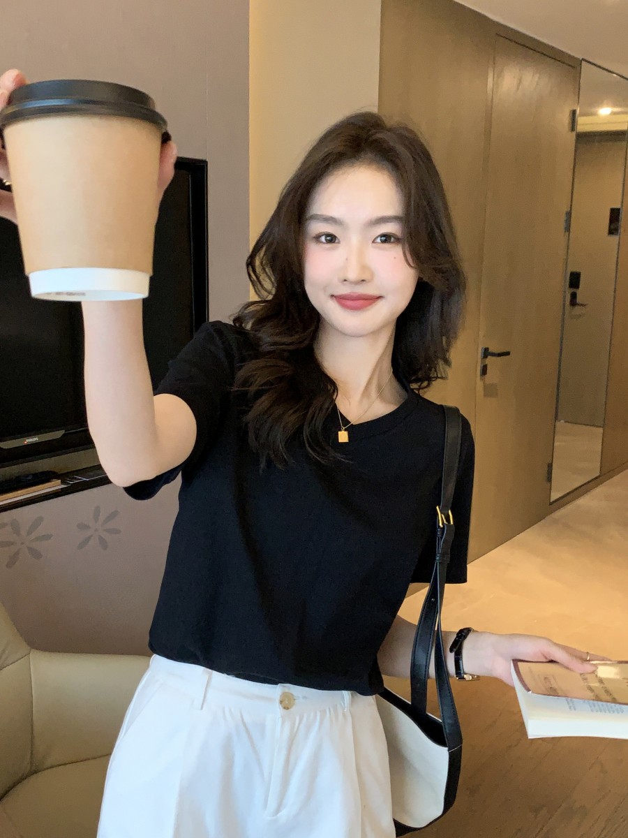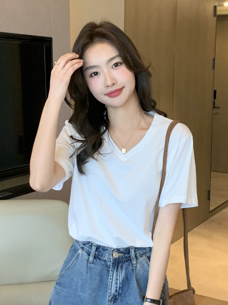| nameOriginal | V-neck T-shirt women's short sleeve white loose slim 2024 summer new cotton shoulder chicken heart collar solid color top |