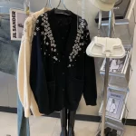 V-neck three-dimensional flower knitted cardigan women's coat beaded