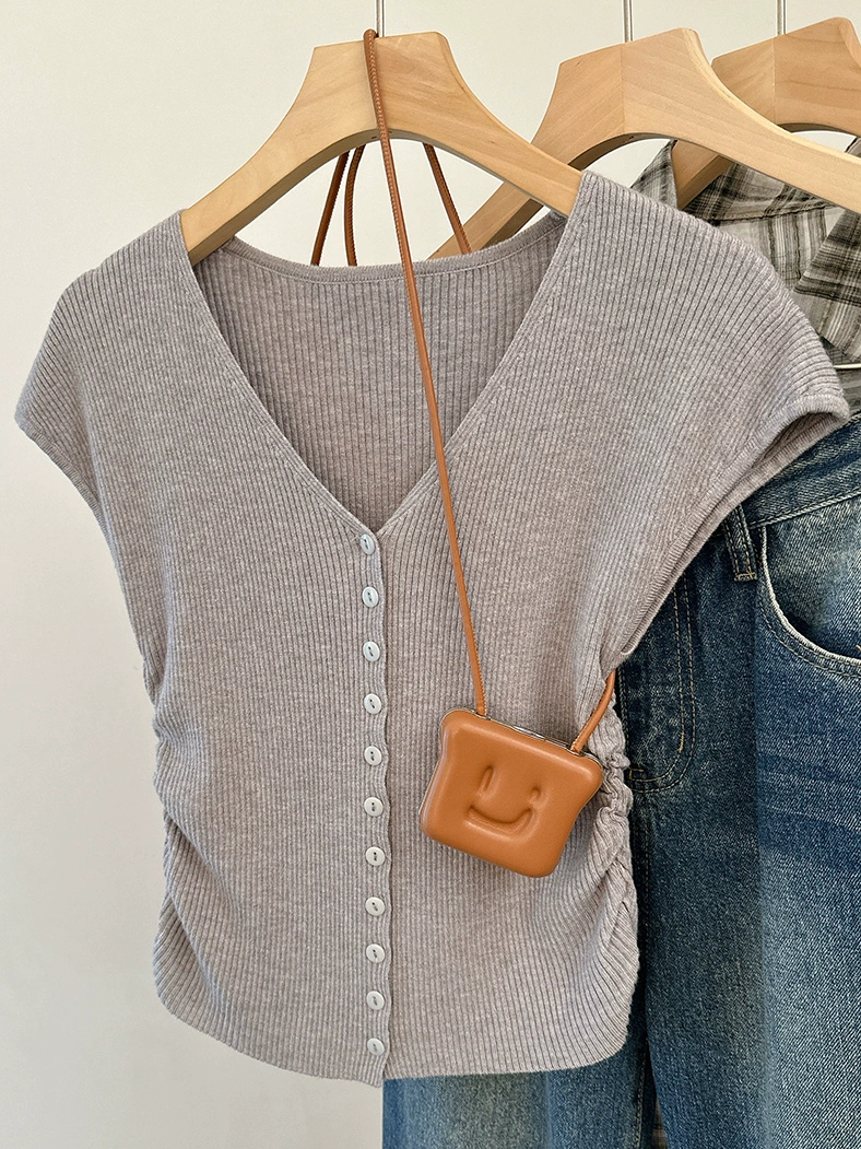 | nameOriginal | V-neck waistcoat knitted cardigan short-sleeved jacket women's 2024 new summer waist smocked thin slim fit short top |
