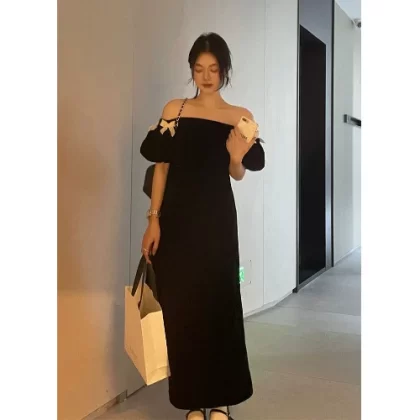 تنورة مخملية سوداء فضفاضة على شكل حرف A مع فيونكة ثلاثية الأبعاد