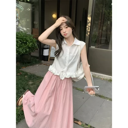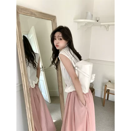 | nameOriginal | Versatile sleeveless pink high-waisted long skirt with lapel buds |