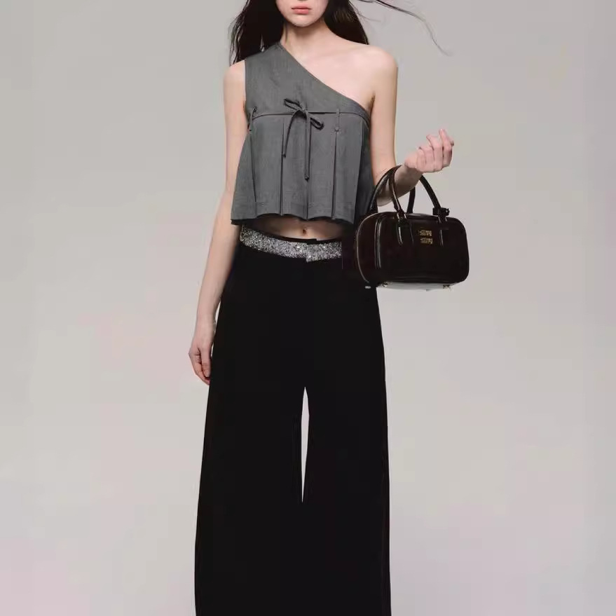 | nameOriginal | Vintage Grey Lace-up Slant Shoulder Camisole Vest Women's Summer Loose Irregular Spice Girl Sleeveless Short Outer Wear Top |