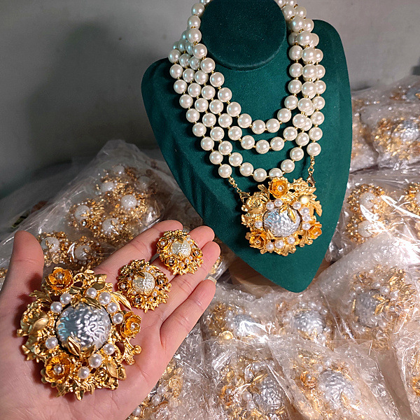 | nameOriginal | vintage vintage Three-dimensional Flower Embossed Imitation Pearl Brooch Earrings Silver Ear Stud Ear Clip Necklace Set for Women |