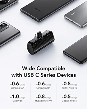 شاحن VRURC الصغير المحمول 5000 مللي أمبير الخاص بنا مثالي لأجهزة سلسلة USB C من سامسونج وأندرويد. وهو متوافق مع مجموعة واسعة من الأجهزة، بما في ذلك سامسونج جالاكسي S21، وهواوي P50، وموتورولا موتو G7، وجوجل بيكسل 5A، وإل جي G7 بلس، وOnePlus 9 Pro. يضمن القابس المدمج (USB C) مع توصيل طاقة بحد أقصى 20 واط الشحن السريع دون الحاجة إلى كابلات إضافية. يتميز بنك الطاقة USB C ثنائي المدخلات بقابس USB C ومنفذ من النوع C، مما يسمح بالإدخال ثنائي الاتجاه. الحجم الصغير للغاية وغطاء الترقية يسهلان الحمل، ويوفر الحامل المعدني المدمج القابل للطي وضعًا أفقيًا/رأسيًا متعدد الزوايا لمشاهدة مريحة. يفي بنك الطاقة هذا بمعايير الطيران الدولية، مما يجعله سهل الاستخدام في الطائرات. إنه متوافق مع جميع أجهزة USB C تقريبًا، باستثناء أجهزة iPhone.